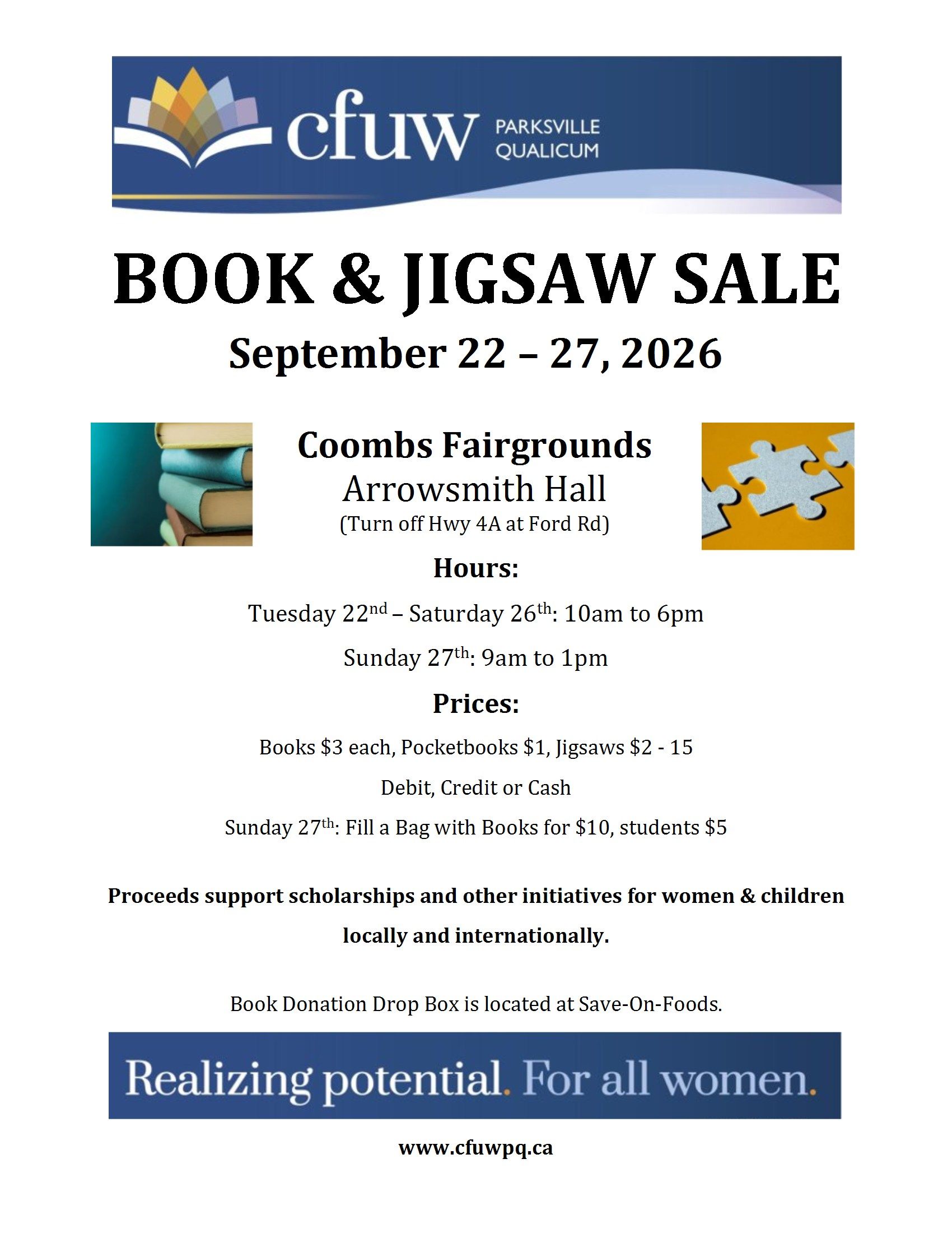 This year the sale will once again be at the Arrowsmith Hall at the Coombs Fairground site. For information on specific dates and times, or what kind of books we are looking for, please contact our booksale team at booksale@cfuwpq.ca , or visit our website
